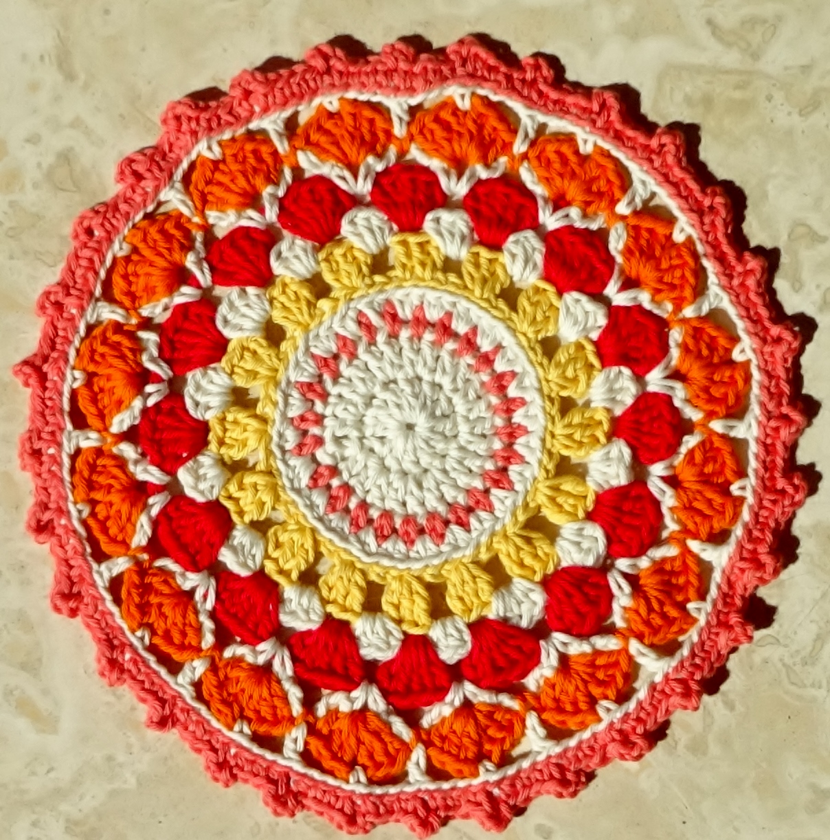 I wanted to brighten up a corner and I decided there was no better way than with a little crochet. However, I wanted something small not as big as a blanket or cushion. After some thought I decided to try a mandala. I have never made a mandala before let alone designed one but it is only a large round motif and I have lost count of the number of motifs I have designed……..