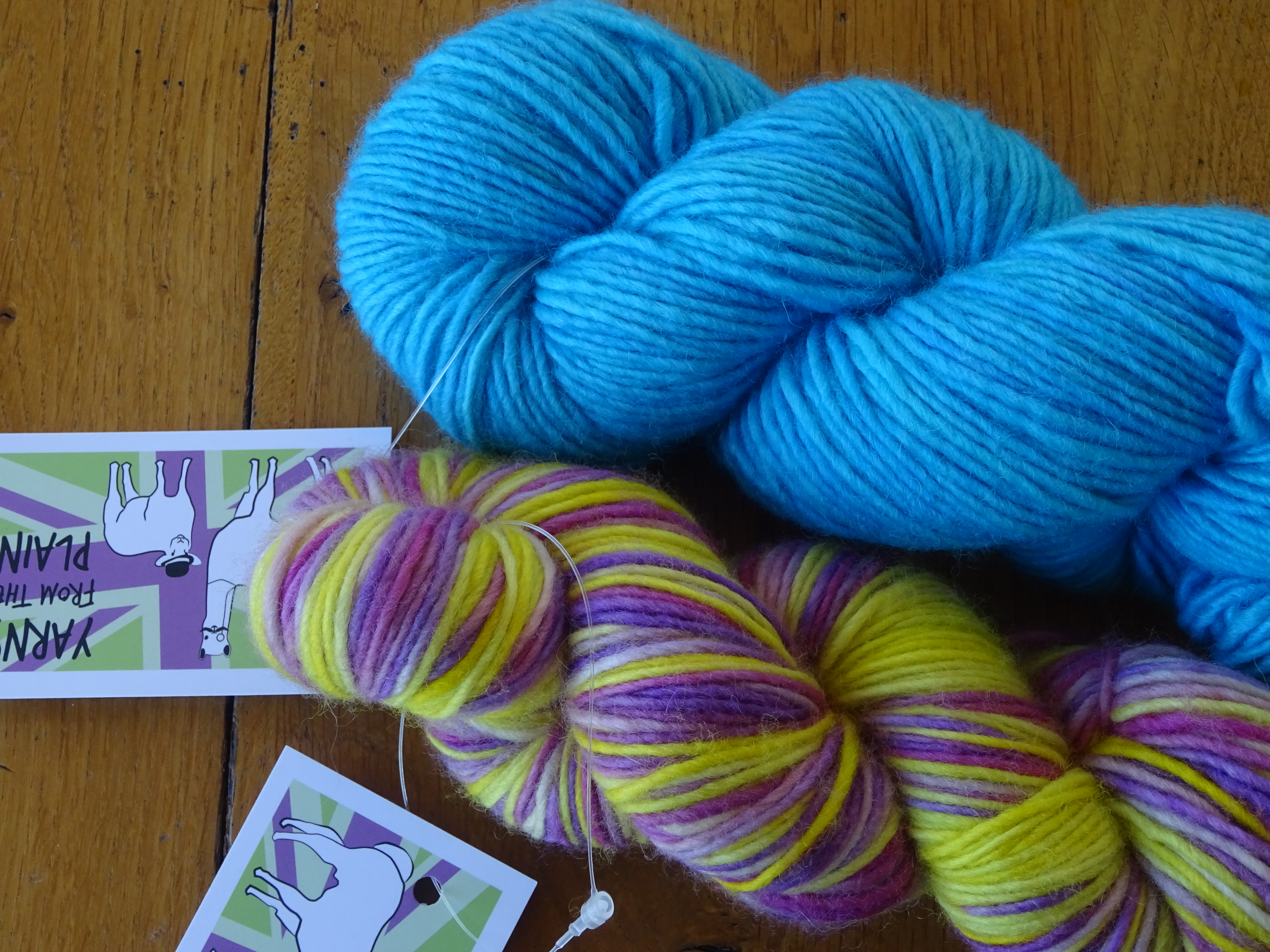 They are both the same yarn base called Plumley – a single spun yarn, 100% Blue Faced Leicester Roving DK, approx 200m per 100g skein.