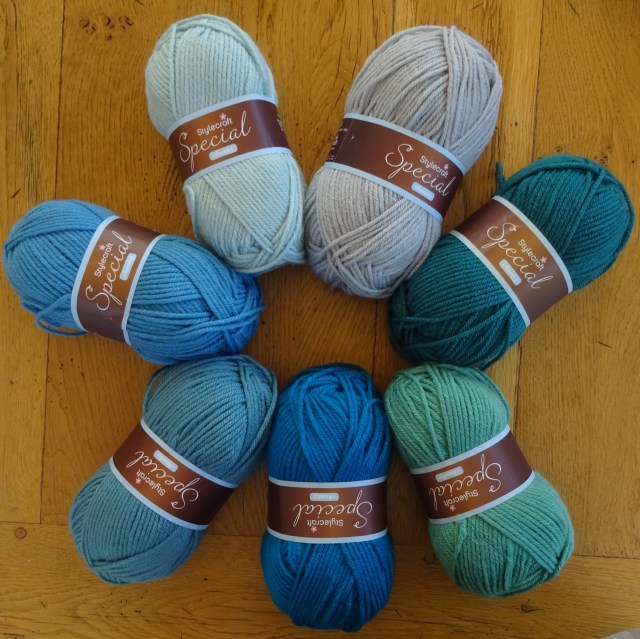 Don’t forget there will be a Twixmas Mandala CAL from 26th to 31st December (in DK or 4ply yarn) and starting at the end of January a wrap/blanket CAL using broadly the same motifs but different yarns and colour schemes. Just to whet your appetite here’s the yarn I’m using in the dual CAL:
