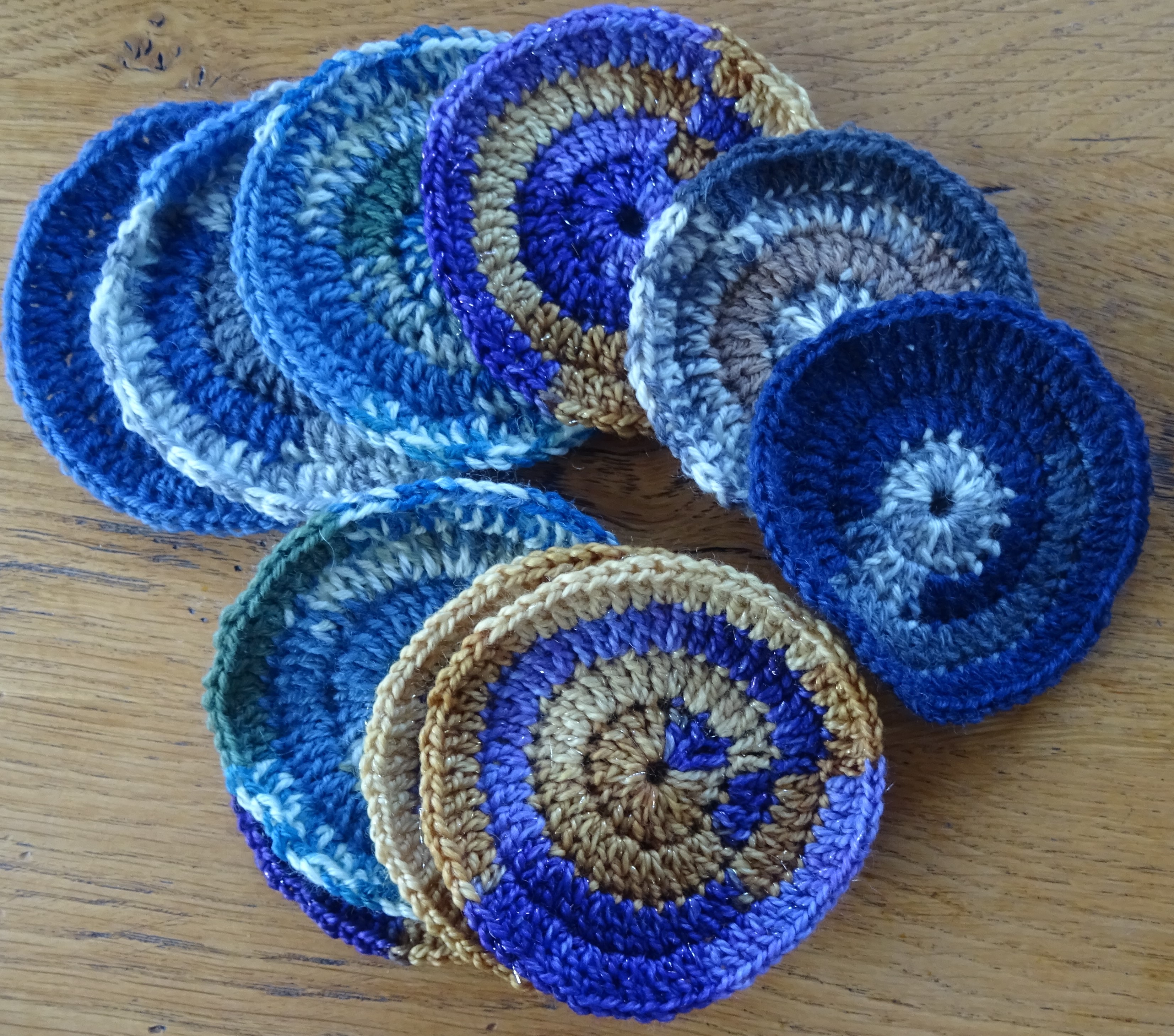 I hope you are all ready for Part 1 of the Round Again Blanket CAL. This is the first of 6 parts of the CAL and introduces the simple circle. This is not at all difficult provided you know how to work in the round and count stitches. There are only 4 rounds and I made quite a few of these, however they are very quick to make. They will help you to see how some of your variegated scrap sock yarns look in the round and I recommend you make one of these circles for each of your different scrap yarns. Don’t forget there is a paid for pattern on Ravelry which is also being released in parts and has a US crochet terms available too.
