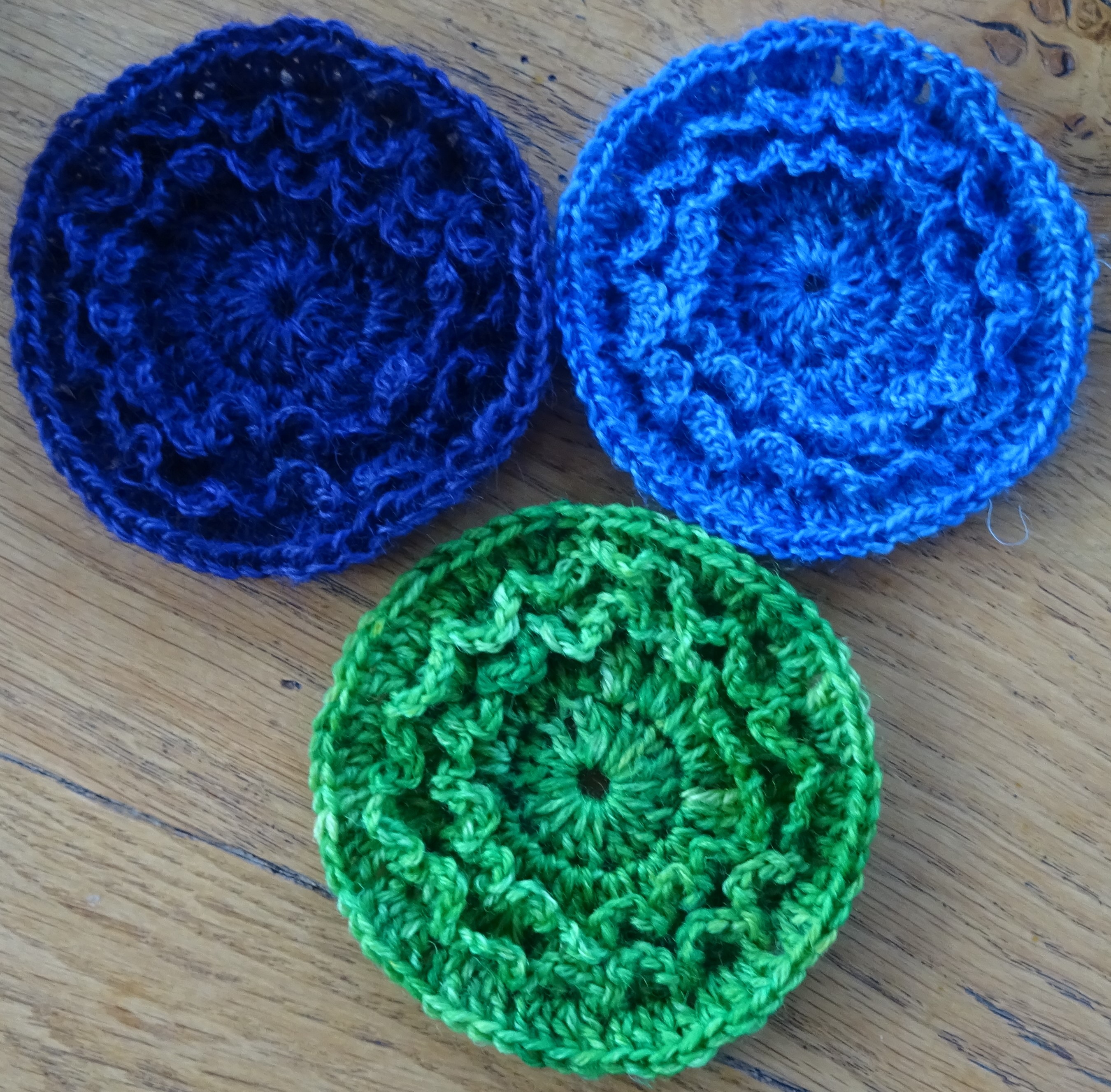 So this is Part 3 and I know I shouldn’t have any favourites but these are definitely my favourite variations. They involve what I call ruffles and there are 3 different ruffle variations. They are very effective for single colour yarns. They all use more yarn than Circle 1, the small and large ruffle used about 3.5g/14m and the double ruffle used about 3.8g/15.25m.