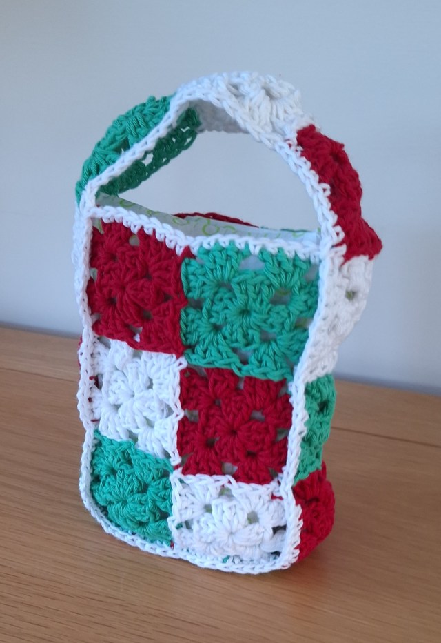 The fourth bag is again based on granny squares and I designed it specifically for a present of a bar of luxury soap (plus a washcloth, oops did I make a present?).   So I called it the Soap Gift Bag. Granny squares are extremely versatile and can be joined together to make a larger shape and 3D shapes.  Small granny squares are also great for using up leftover yarn and are more versatile when creating 3D shapes.  So this is a perfect stashbusting gift bag.