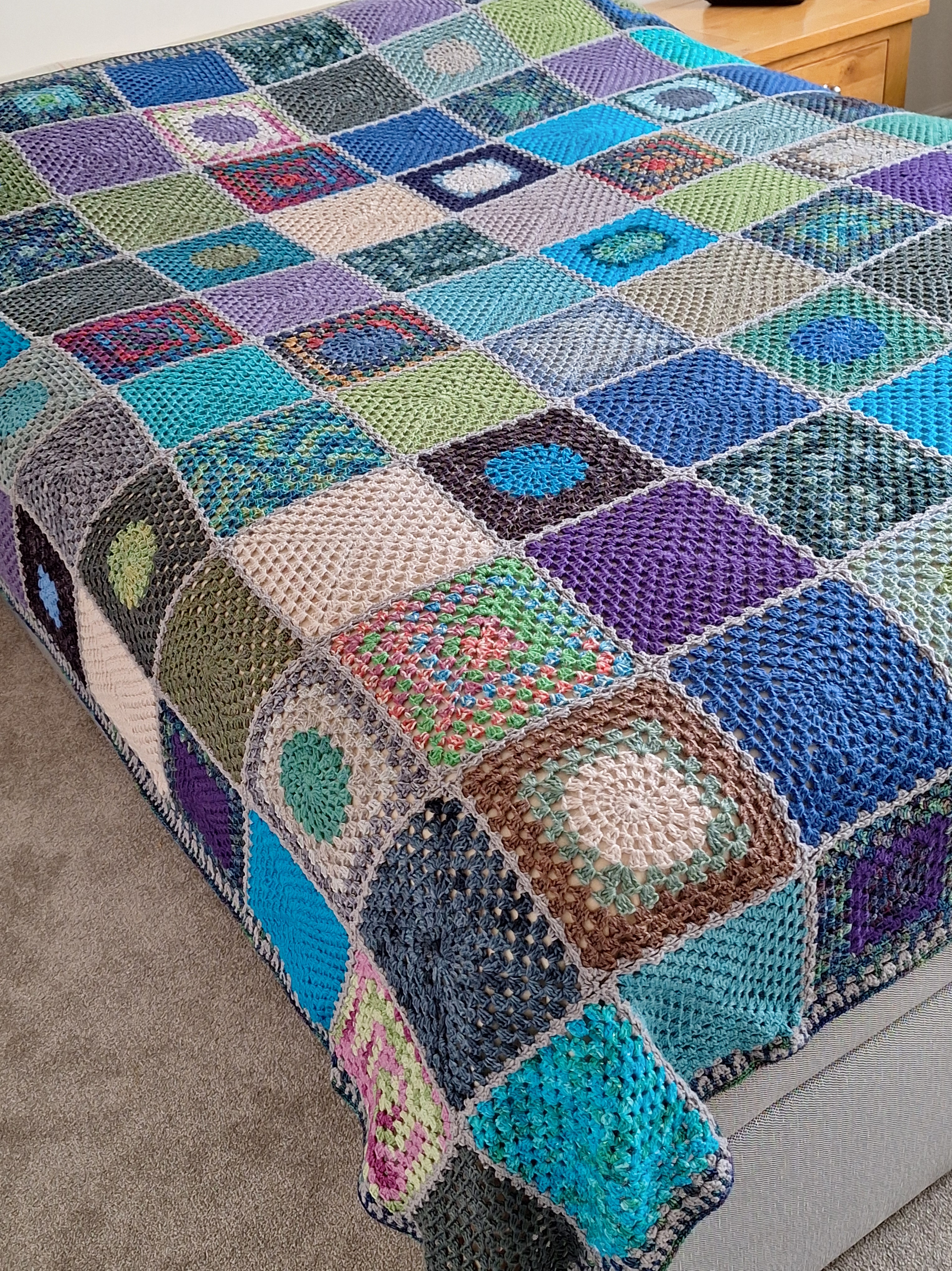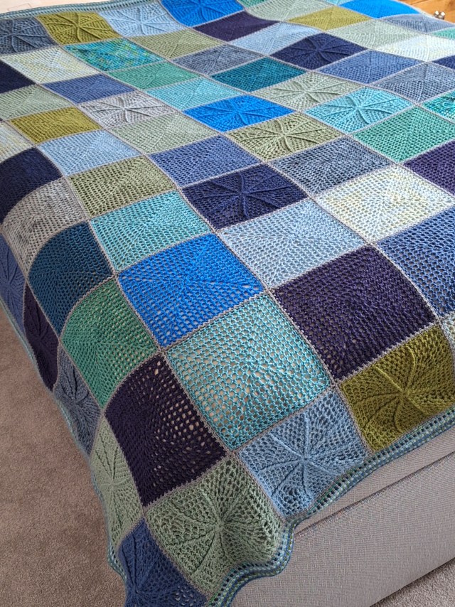 My Ultimate Stash Blanket made in 2023. I used a couple of variations of some squares I designed (Octoghan and and a simple open square) and carefully recorded the yarn I used – over 5,000m of yarn!